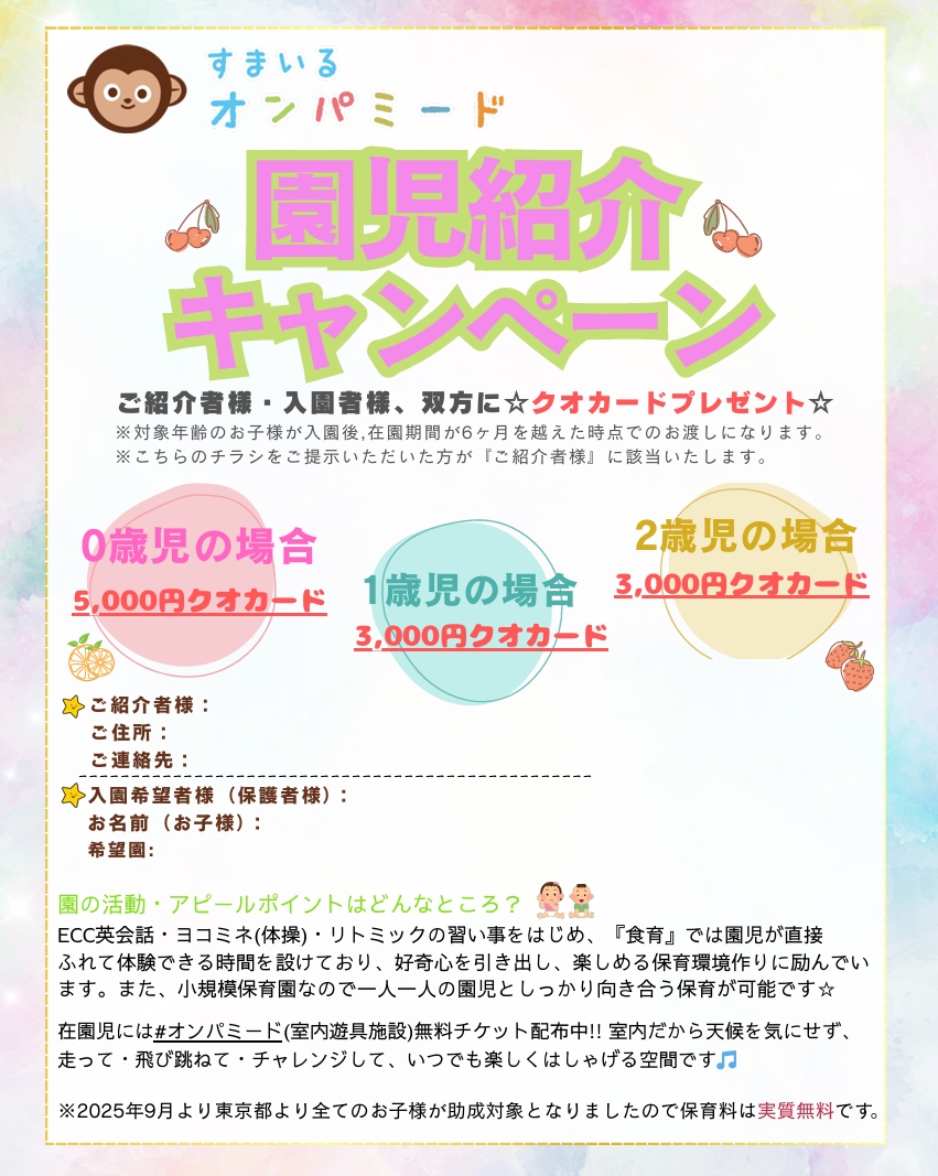 ご紹介いただけますとご紹介者様、入園者様にクオカードをプレゼントいたします!