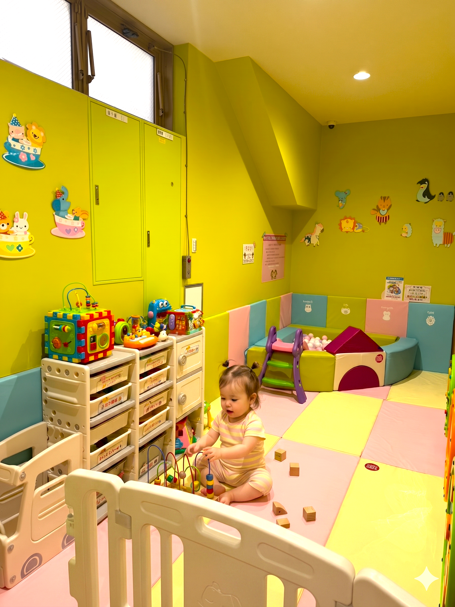 「まだハイハイの赤ちゃんでも大丈夫?」という声をよくいただきます。オンパミードには赤ちゃん向けのエリアもご用意しており、ハイハイや寝返りの赤ちゃんでも安全に過ごせる環境が整っています。